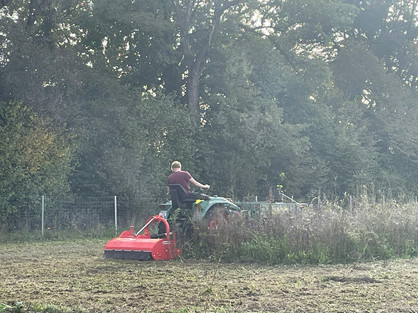 As the summer comes to an end the Orchard needs to be prepared for Winter and the next summer season. The key aspect is to cut back the growth. This is done with a machine that will cut and scatter the grass cuttings back into the earth.